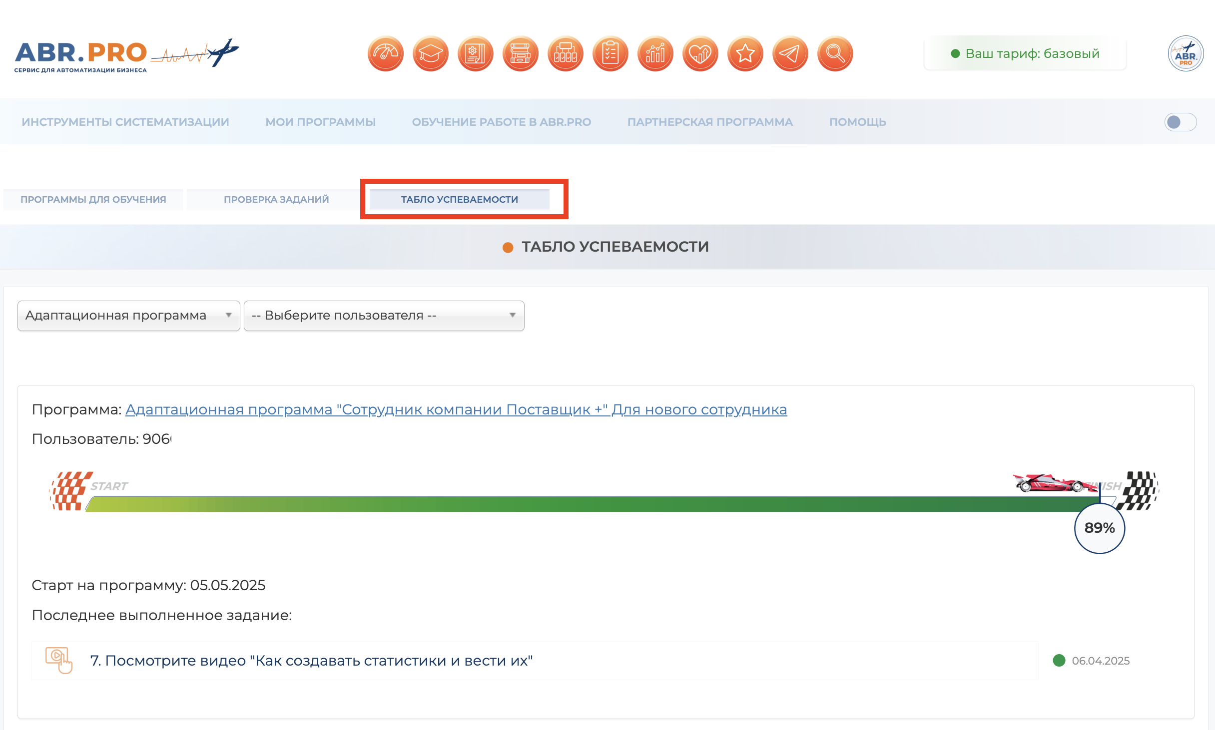 Это панель, на которой вы можете отслеживать, как проходит обучение каждый сотрудник: